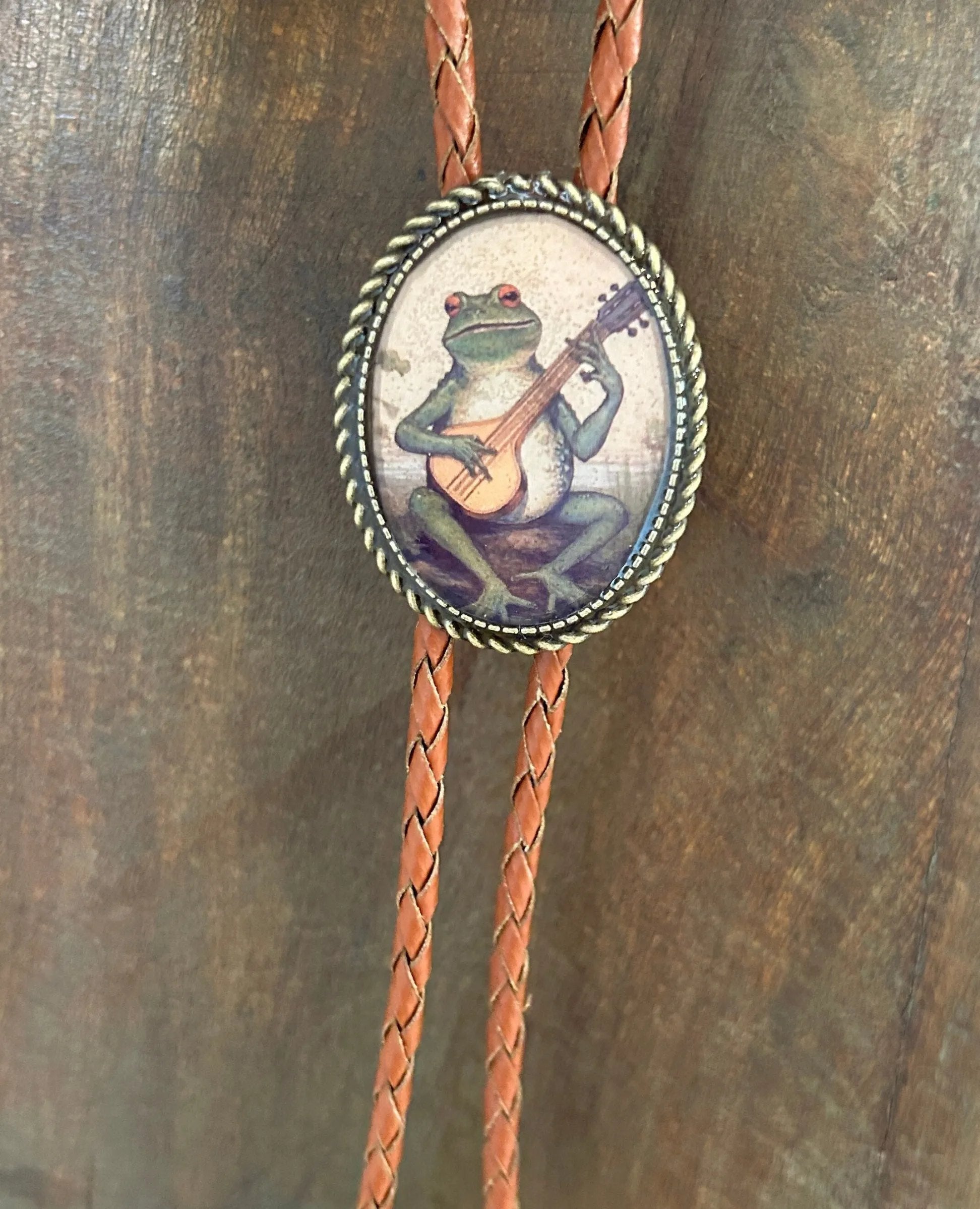 This awesome bolo features a frog playing a banjo design. It is solid metal backing with an inlaid print covered in resin. Handmade in our shop. Quality guaranteed.