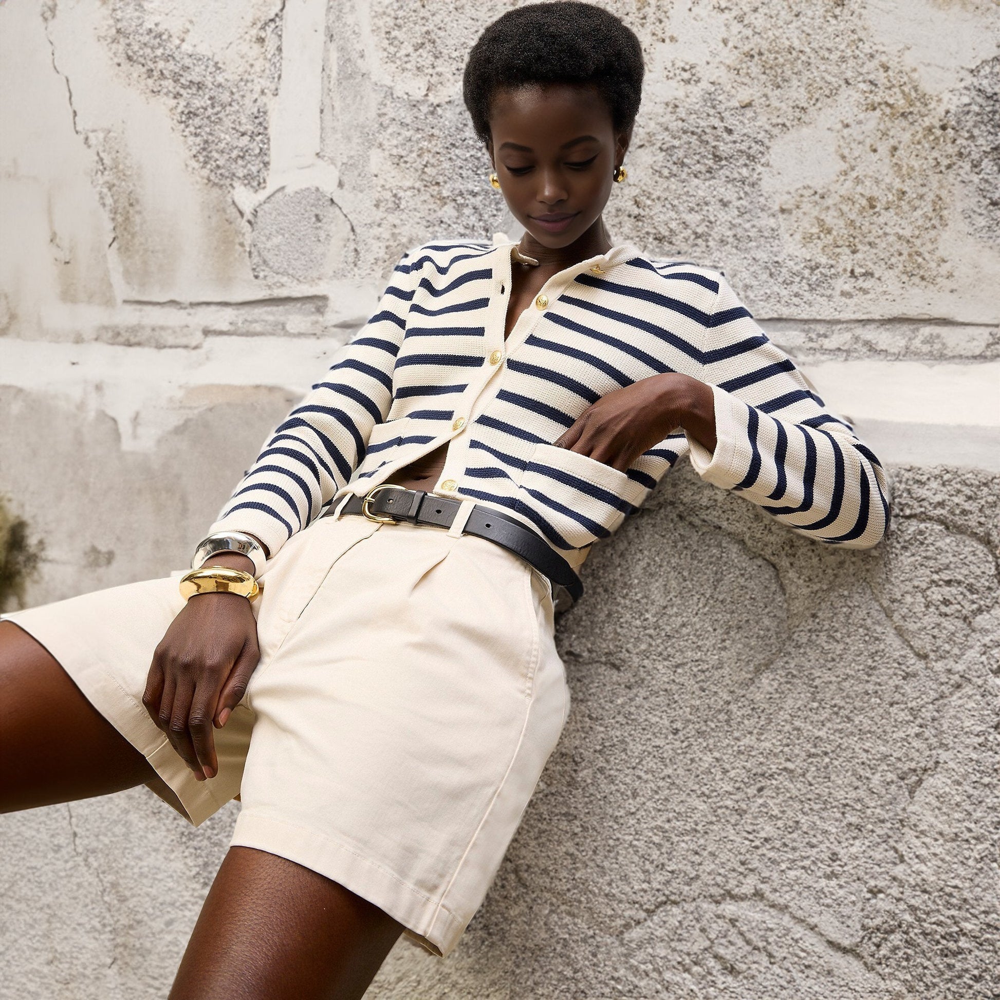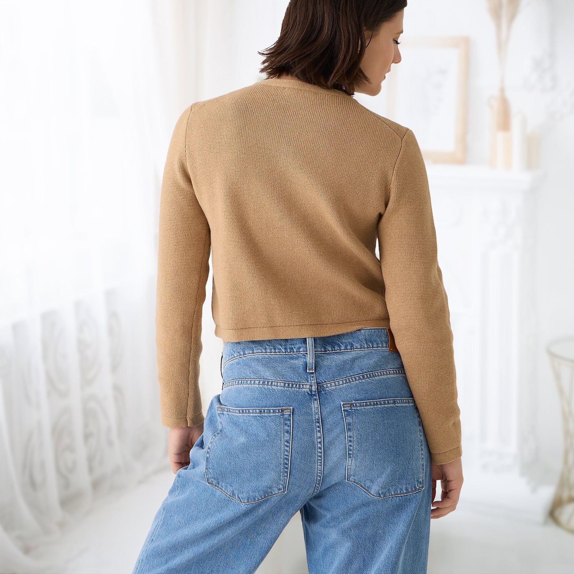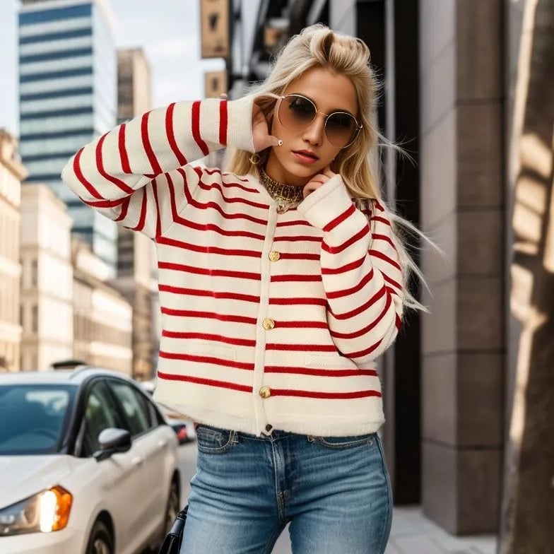 With striped or solid colors, long sleeves, and a round neck, this cardigan exudes confidence. Two front patch pockets and five functional buttons add the perfect touch. Designed for all body shapes, this relaxed-fit cardigan is versatile, elegant, and classic.