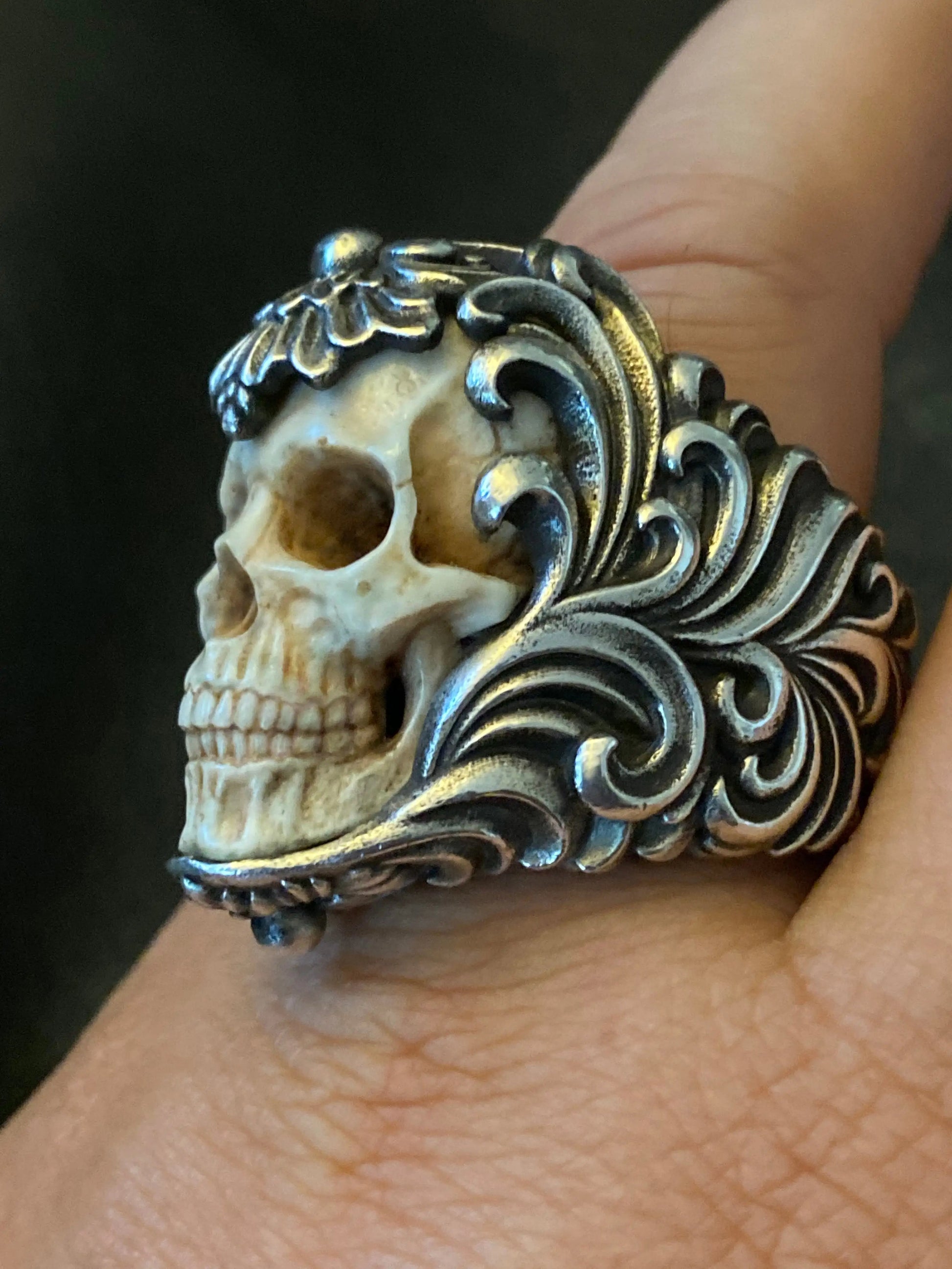 đź”±The super realistic skull carved from top quality deer antler of high density embedded in an intricate floral ornament silver ring band makes this piece an absolute eye-catcher.Â