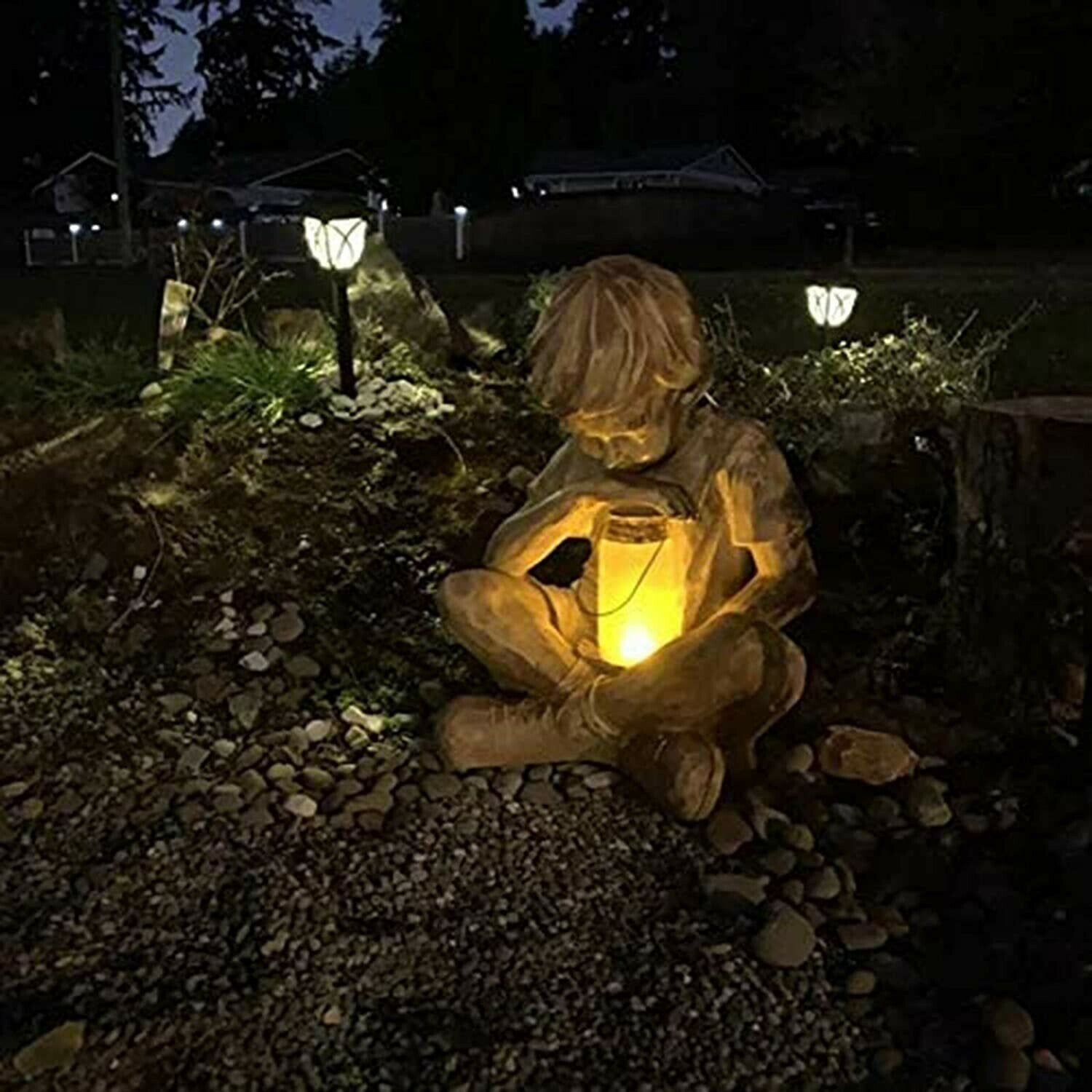 - 🌸【Warm Light God Light Statue Decor】Let this artful statue brighten up a corner of your garden. Looks great in an indoor greenhouse.This Glimpses of God Boy Statue can be perched anywhere.The impeccable finish and realistic texture bring whimsical charm to your garden, porch, patio, or yard.Solar powered, it stores electricity during the day and lights up automatically at night