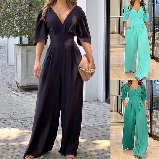 Introducing the V-neck high waist loose wide-leg jumpsuit, a dress that embodies the essence of 2023 fashion like never before.