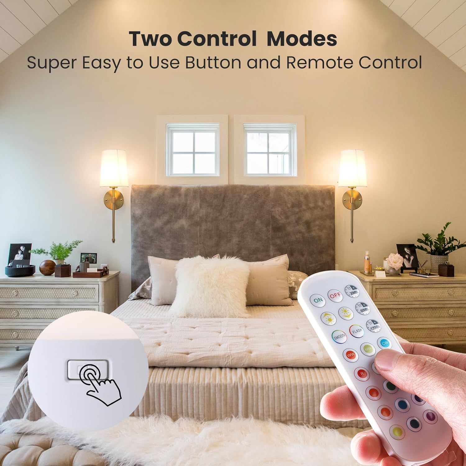 - 【Remote and Push Button Control】Our battery light bulb support 2 control modes, 1, Push Button Control: short press - turn on the light to switch the color temperature, long press - turn off the light.2, Remote Control: Quickly switch the light on/off, adjust the brightness, switch the color, 30/60/120 minutes timer function, and provide “Smooth” mode light and “Flash” color mode. Remote Working range is 10 meters