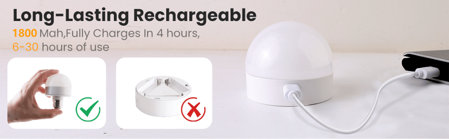 - 【E26 Rechargeable Light Bulb for Lamp】These battery operated light bulb with 1800 mAh high capacity battery,Type-C USB cable charging to full takes 3-4 hours, and running lasts 8-24 hours,It’s also super easy to charge. The magnetic base that stays screwed into the bulb socket, just pulls off the top to recharge.No need to screw and unscrew a light bulb multiple times.perfectly catering to your daily lighting need